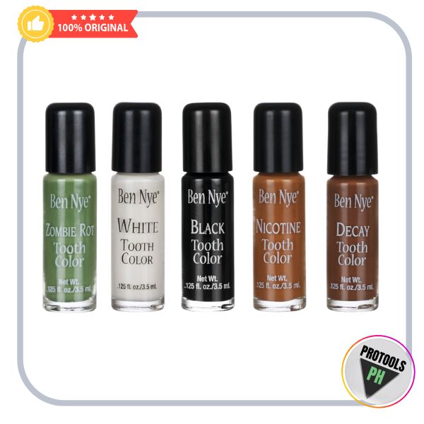 Tooth Color is an alcohol-based liquid that can be used to simulate a variety of visual effects on teeth. Create smoker’s mouth with Nicotine, gruesome undead teeth with Zombie Rot, and a general lack of hygiene with Decay. Black works great for warriors, boxers, and pirates missing teeth in stage productions.