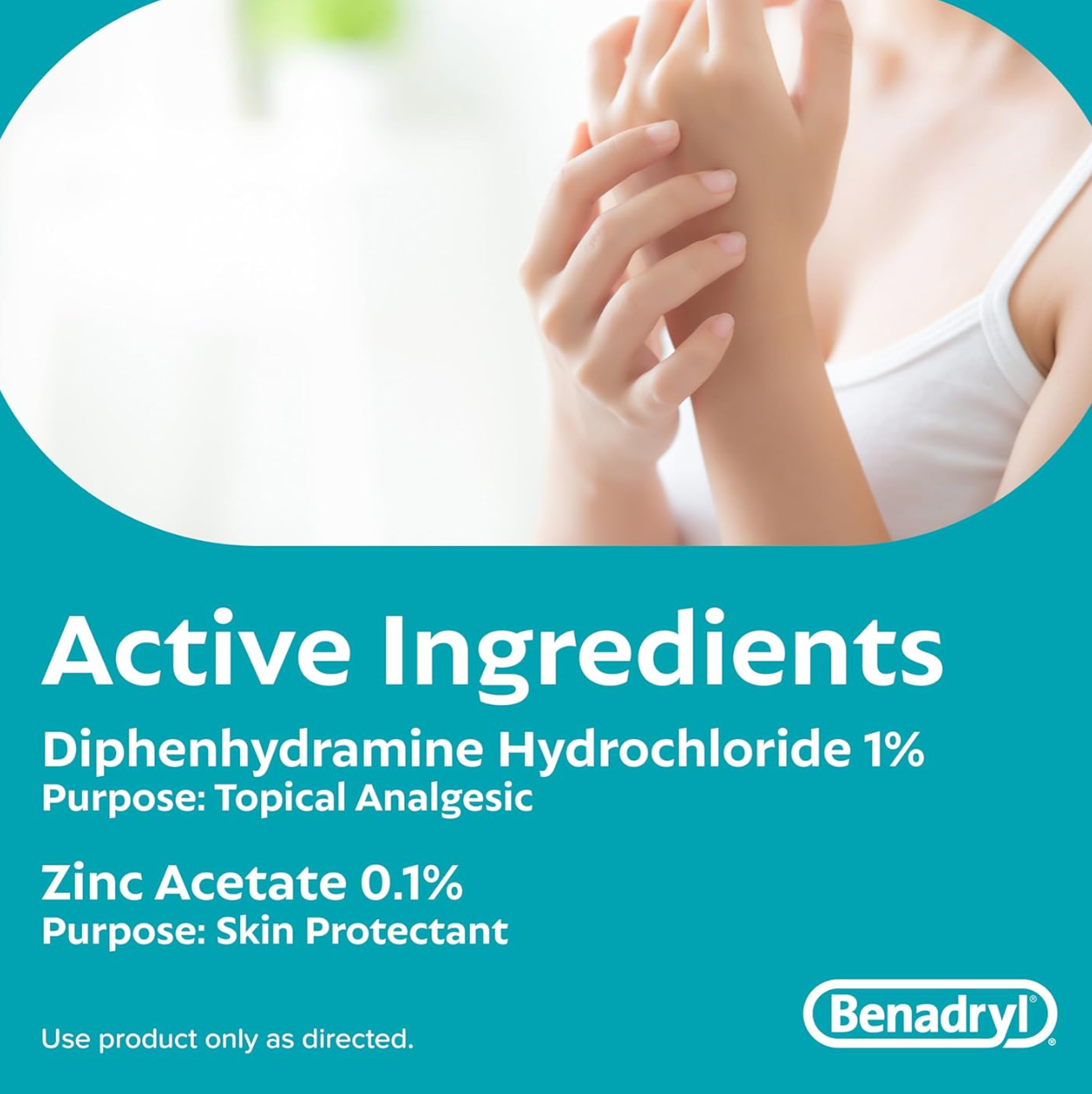 - Itch relieving formula contains 1% diphenhydramine hydrochloride, a topical analgesic pain reliever and 0.1% zinc acetate skin protectant