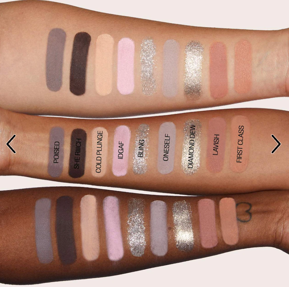 - 18 x .56 oz/ 16.1 g Eyeshadows in shades Iced Out (white duo chrome metallic), High Life (soft purple matte), Faux Fur (chocolate brown matte), Poised (pink grey matte), Cold Plunge (neutral nude matte), Oneself (light grey matte), First Class (peachy matte), Platinum (silver metallic), Unapologetic (burgundy matte), IDGAF (pink matte), Gold Standards (bronze metallic), Avalanche (white matte), Aurora (deep pink metallic), VVS (sparkly pink metallic trio chrome), She Riiich (deep brown matte), Bling (silver bio glitter), Diamond Dew (sparkly silver metallic trio chrome), and Lavish (dusty pink matte)