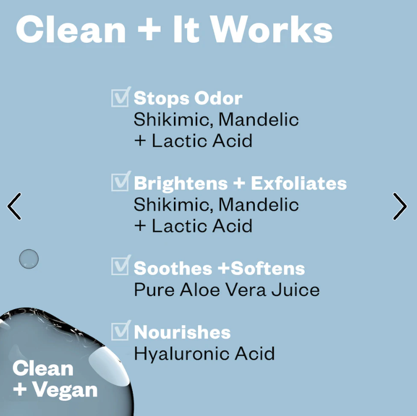What Else You Need to Know: Featuring a blend of shikimic, mandelic, and lactic acids, this deodorant targets odor where it starts by supporting a pH environment where odor-causing bacteria can‘t survive. Free from aluminum and baking soda, the cooling formula soothes skin, visibly brightens, helps prevent the occurrence of ingrown hairs, and feels good to roll on.