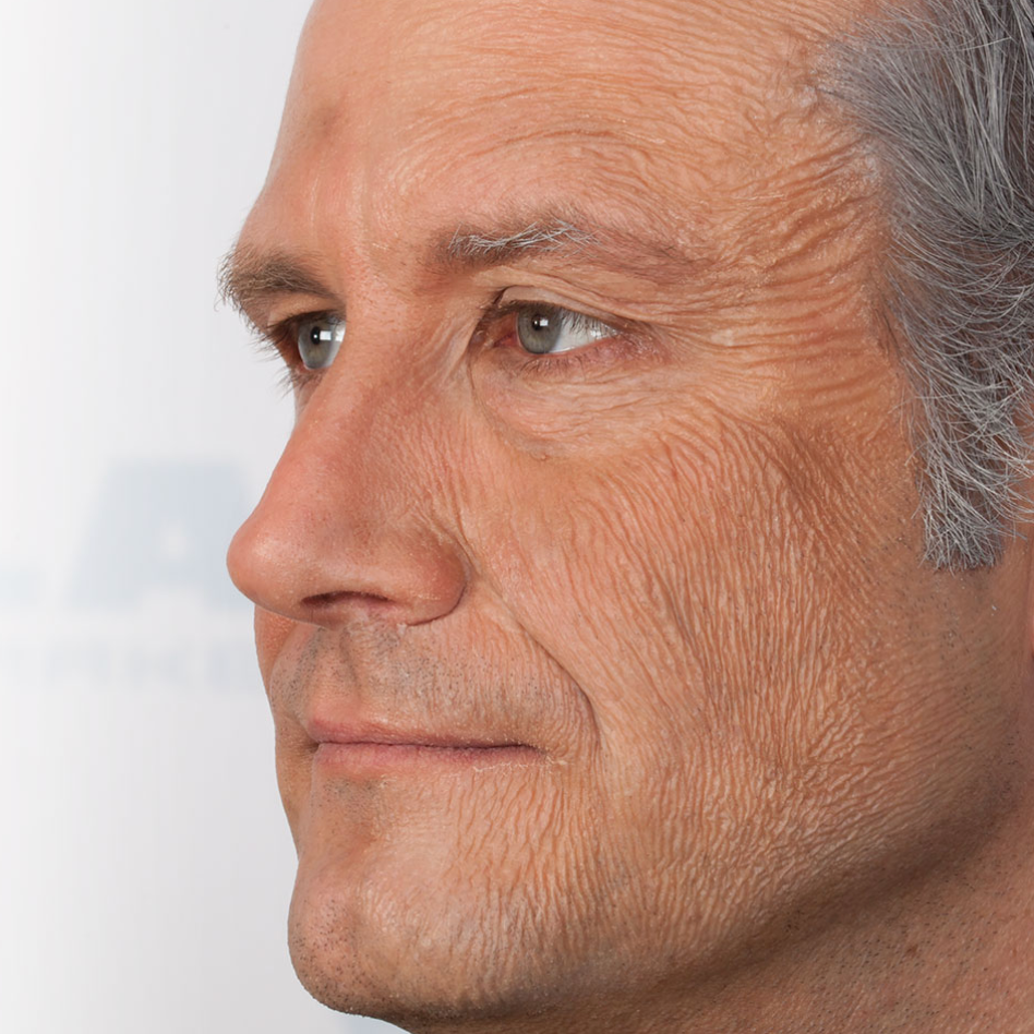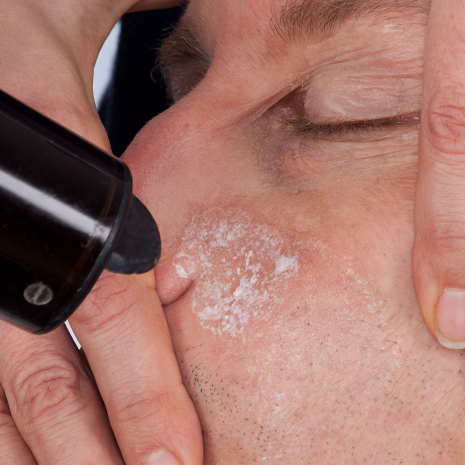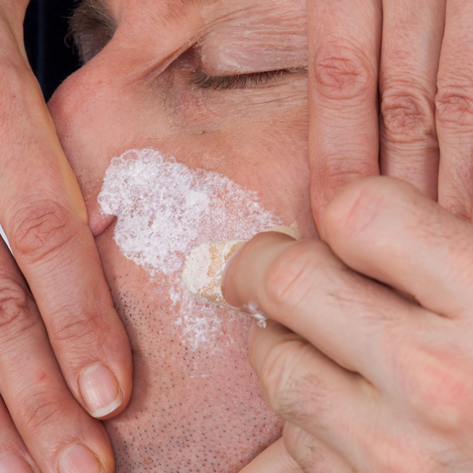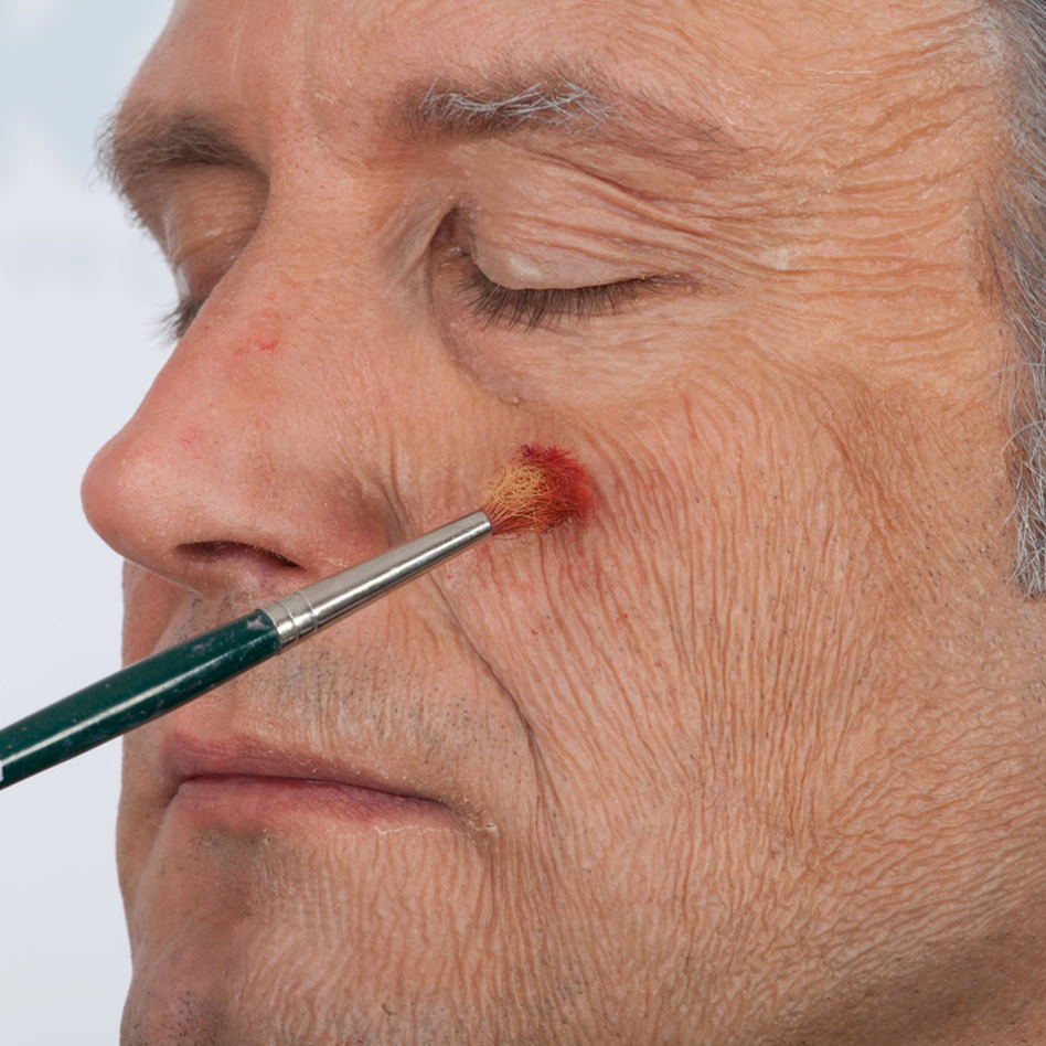 OLD AGE STIPPLE Old Age Stipple is a latex preparation for simulation of aged and wrinkled skin. Stretch the skin between thumb and index finger, and apply Old Age Stipple with a small latex sponge. Allow to dry; you can use a hair dryer to speed up drying. Then carefully apply powder. Repeat this procedure until the desired effect is achieved. For coloring, use Special Greasepaint for Rubber Items. For removal, Old Age Stipple can be peeled off the skin.