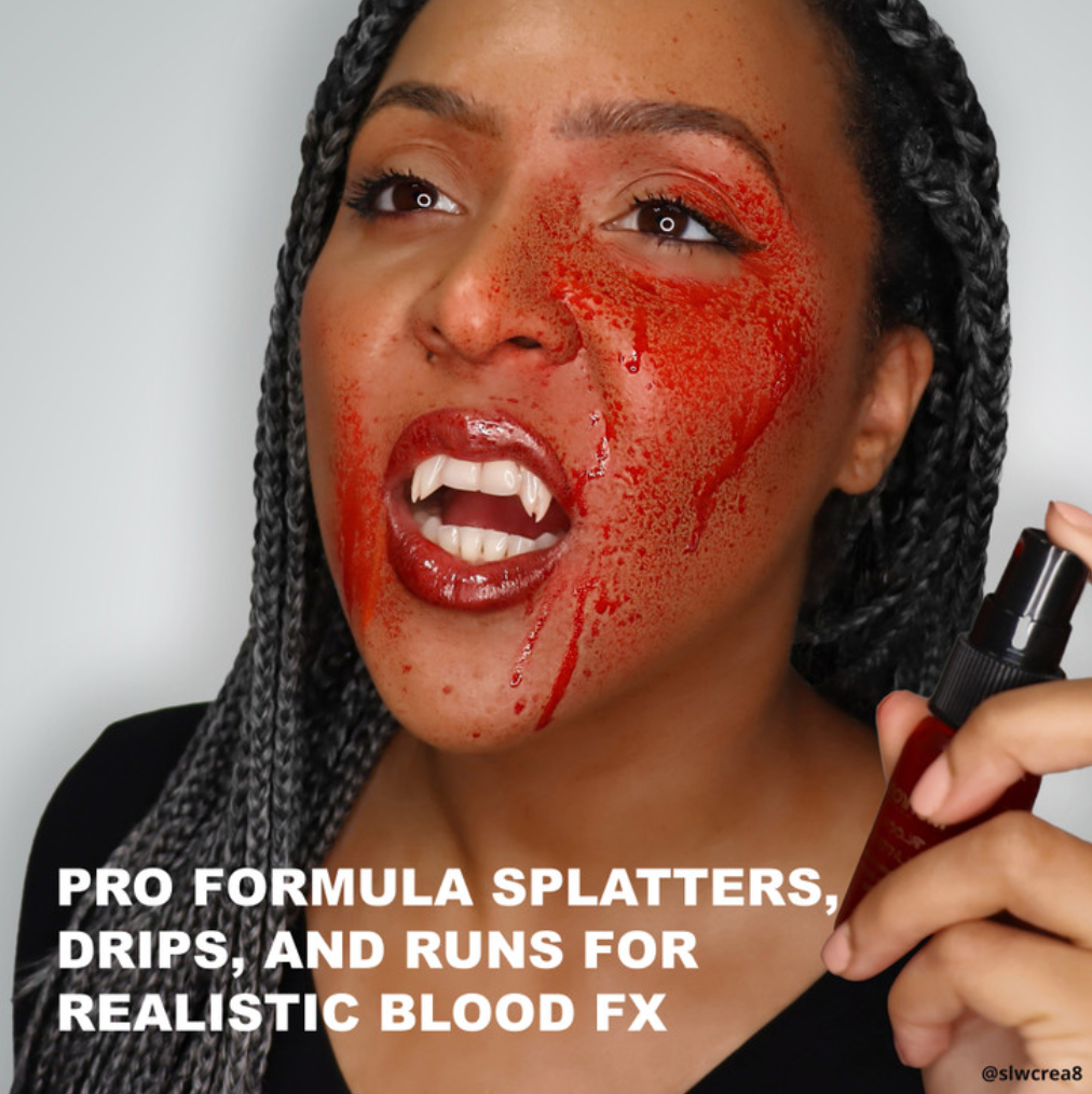 Spray directly onto the skin or on top of prosthetics. Hold closely to the skin for saturated blood drips and hold farther away for speckled blood spatter. Avoid contact with eyes. Product may stain clothing. Patch test recommended. Wash off with soap and water.
