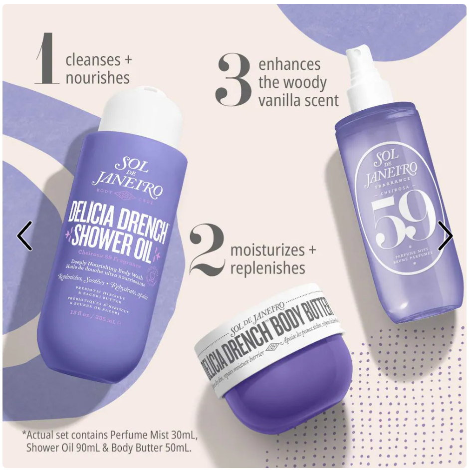 What Else You Need to Know: This is a moisturizing routine for velvety-soft, healthy-looking skin. These products nourish skin as you cleanse with Delícia Drench™ Shower Oil, lock in moisture for up to 24 hours with Delícia Drench™ Body Butter, and finish with the scent of Cheirosa 59 with notes of vanilla orchid and sheer sandalwood.